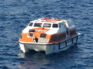 I really enjoy the trek down to the bowels of the ship, as you get closer hearing the water hitting the side of the ship and you can smell the fumes from the tender boats. Turn a corner and there awaits the pontoon, your little orange friend (a.k.a as your tender) and quite often some finely dressed gentleman in their crisp whites 😉 what more could a girl want??