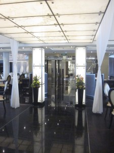 Next we made our way to the buffet area, this was very busy. Many passengers were back on board and simply wanted something to eat. Again I was simply in awe of how even this area was oozing sophistication. You think of a buffet area on your average cruise ship…….now times it by 10 and you get what I was looking at. Although I didn’t manage to get right in to where the food was I did manage to spy at a few of the passenger’s plates. The food looked superb and the choice was unreal. There was more choice here for 400 passengers than you ever find on a ship for 3,000. One woman walked past with a king prawn on her plate that looked like it had been growing in compost for the last 6 months. It was HUGE! The deserts were also special, lovingly prepared and presented as if for a fine dining restaurant.  Everything looked delicious; I think everyone in the group simply wanted to dive in.