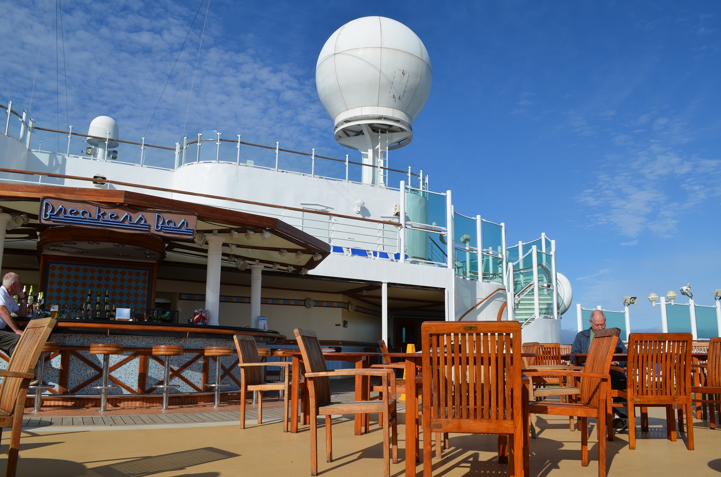 We later spent the early evening exploring the ship, trying to get our bearings. It was a bit confusing at first but once we’d visited every location it started to gel a bit more…. well for me at least, but not so much my wife! Most areas were quite quiet at this time and we had a really good look around and found some lovely spots such as the Terrace Bar and pool high up on the aft of the ship. Despite the sail-away weather being sunny and warm, this pool was empty and covered by netting.