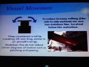 Stabilisers – These act in a similar way to Ballast Tanks but act mainly on the rolling motion of the ship. Stabilisers are located below the water line on both the port and starboard sides and very much resemble the wings of an aeroplane. They extend out from the ship and gently fold away when not in use.