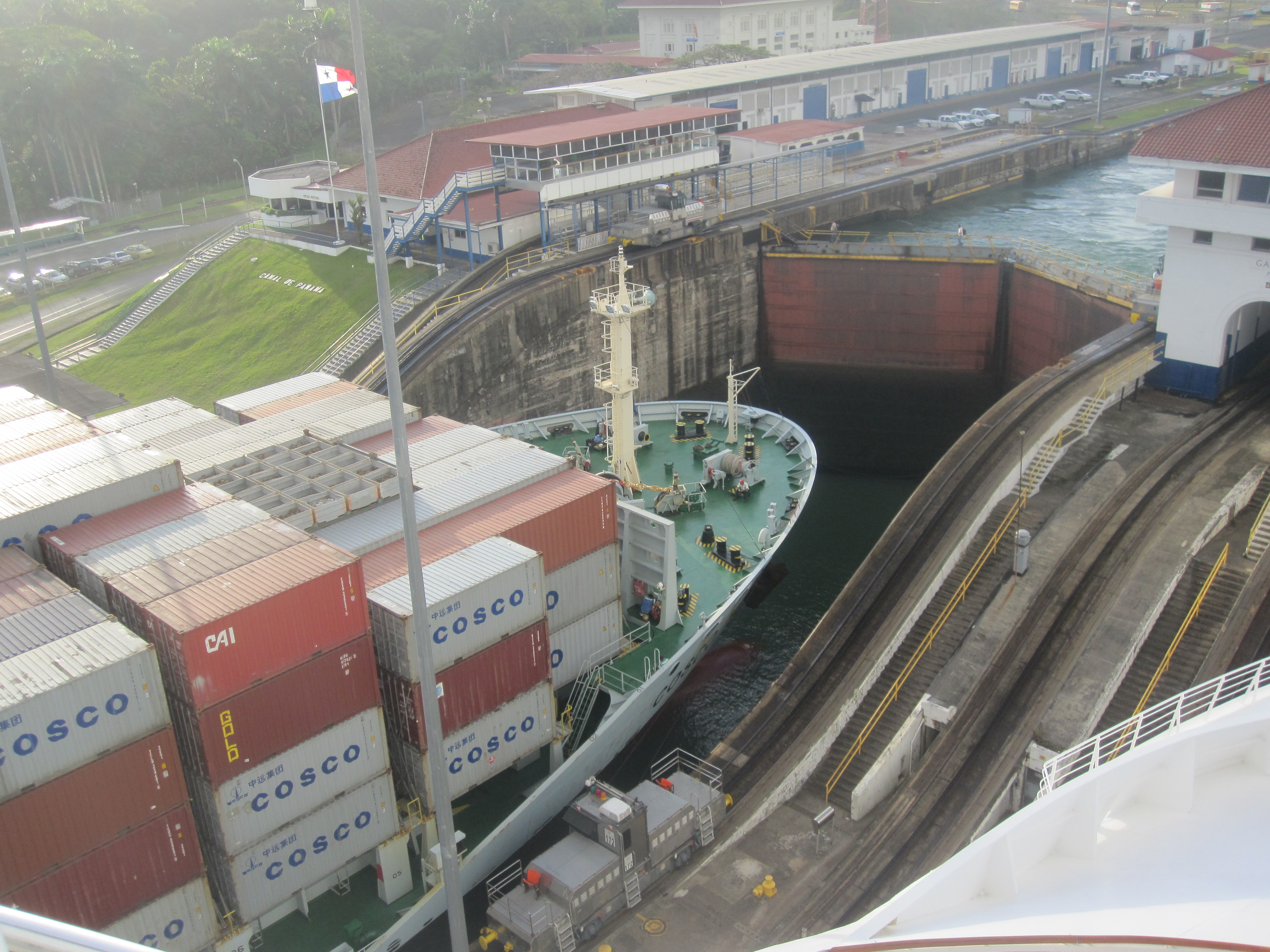 The approach felt like it took forever but before long we were entering the Gatun Locks and finally starting to see what was in store and what a sight it was. We were the only cruise ship and apparently passenger ships take priority over any others so there was no waiting around for us.