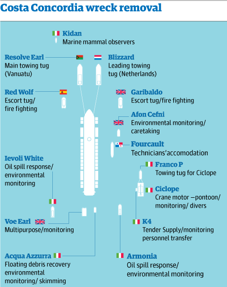 Costa Concordia is being towed by Dutch- and Vanuatu-flagged boats, while the flotilla carries divers, engineers, a medical team and environmental experts with it.
