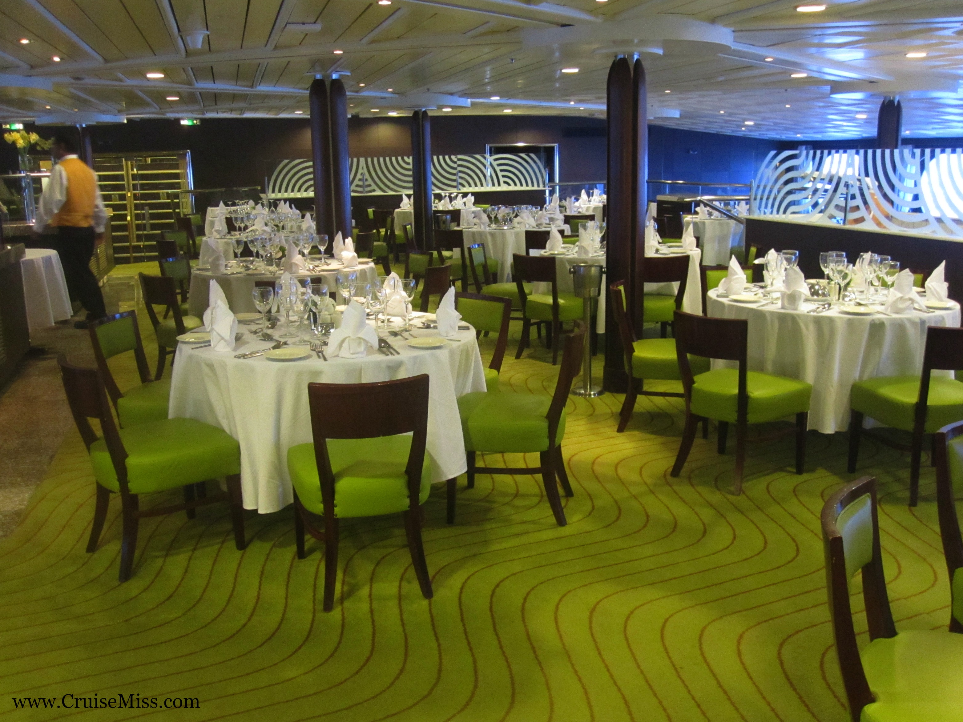 Continuing on with my tour I popped my head through just about every doorway that I came across. The spa was a decent size and well-equipped, as was the gym. Hampton’s Lounge was quite big and perfectly located right outside the Kensington Restaurant – perfect for pre and post-dinner cocktails! I have to say that I absolutely loved the Kensington Restaurant. The décor was a mix of dark wood and bright green carpet/ upholstery and it worked beautifully! Going on colour scheme alone it was my favourite area. If it were my main dining restaurant, I would be one very happy passenger.