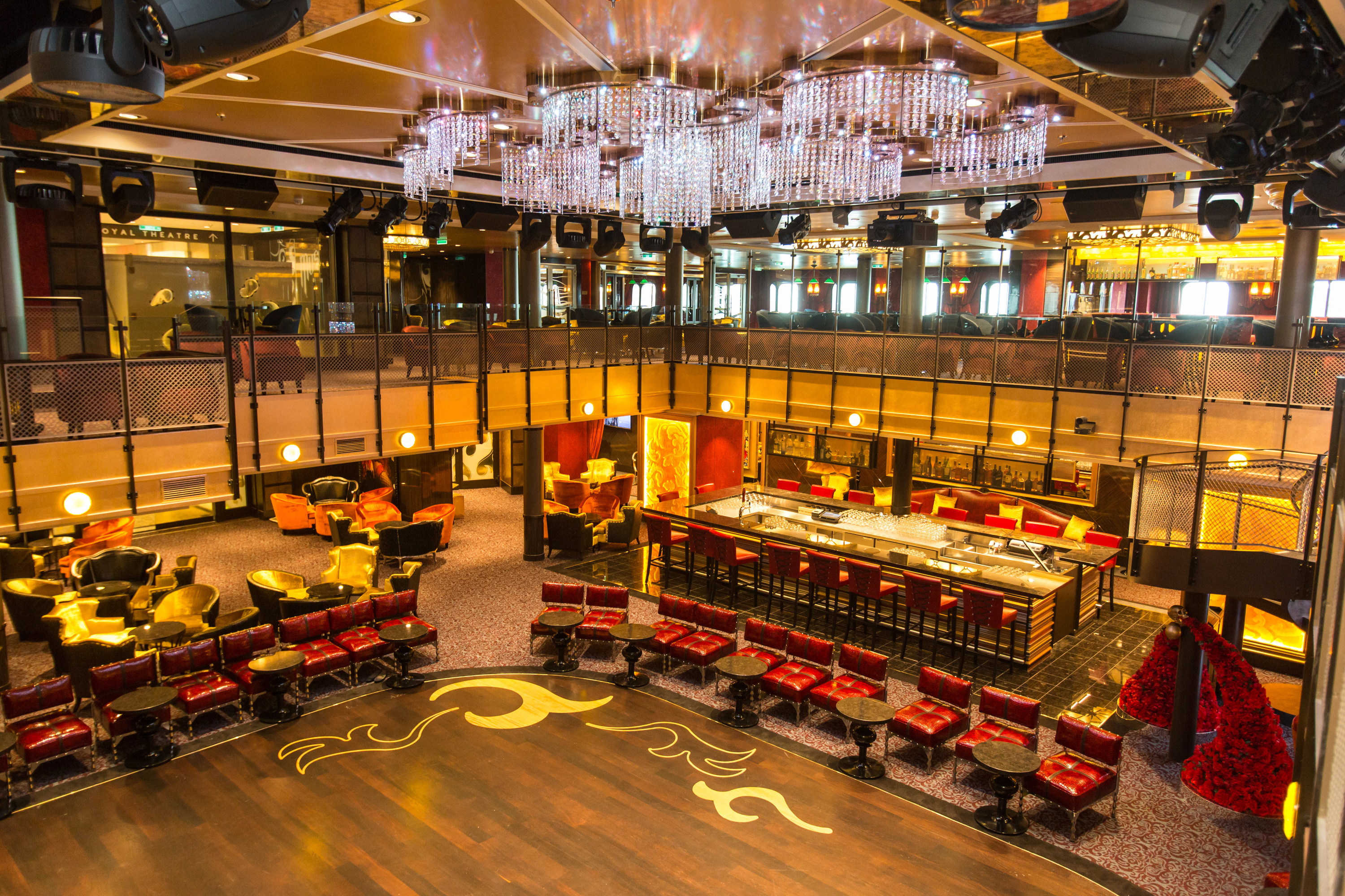 Following dinner I enjoyed a few drinks in the Schooner Bar before heading down to the Music Hall. The Music Hall was absolutely jam packed with people and I loved it. It is on 2 floors, with the upper level overlooking the dance floor beneath.There was a live band for a while and then the DJ took over. It was certainly the heart and soul of the ship that night and I stayed there until the early hours of the morning enjoying the atmosphere. I think the Music Hall was probably my favourite area onboard. It had a Rock n Roll feel to it, skulls coming out of the mirrors, leather bound chairs, some chairs that were covered in black feathers, and a winding staircase that led to a whole other floor of intrigue. It was my kind of place.