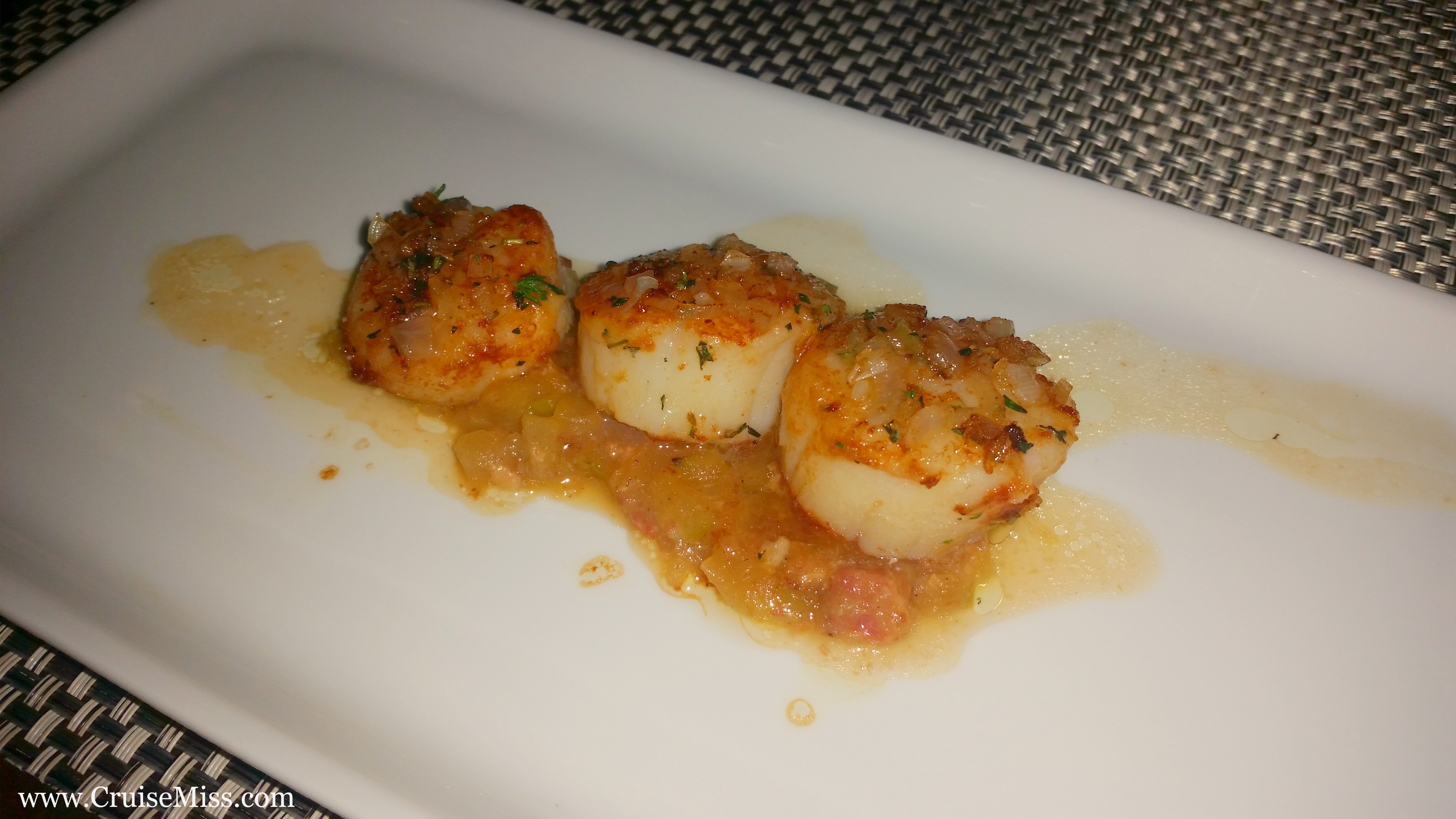 The Grande was the dining option on evening two. The menu looked delicious, but once seated we were given a menu that actually contained a little bit of everything from the specialty dining restaurants, I thought it was a nice idea, but I was a little disappointed to be honest. I struggled with a choice of starter, so in the end opted for the baked artichoke hearts, which I didn’t particularly like. There was nothing wrong with them, they were something I had never tried before and I just didn’t like them. Surf and turf was the main course selection. The prawns and asparagus were delicious, but I asked for my meat well done and it was a rather light shade of pink. It wasn’t to the point where I wouldn’t eat it, but it definitely wasn’t well done. It was OK, but Chops was a far better experience. Dessert, however, was delicious, a flourless chocolate cake with cream and a sprinkle of broken pistachio nuts.