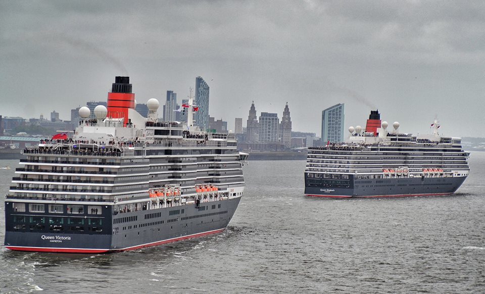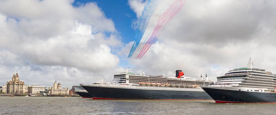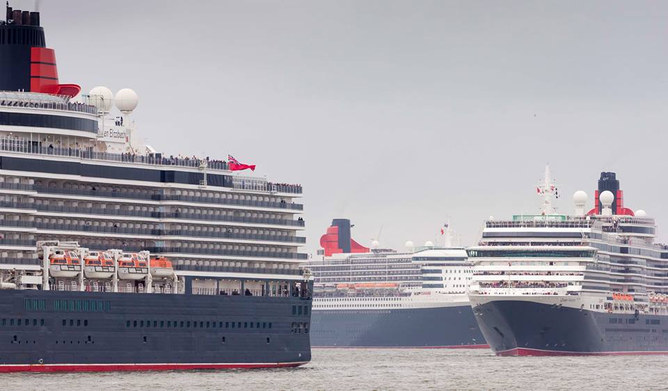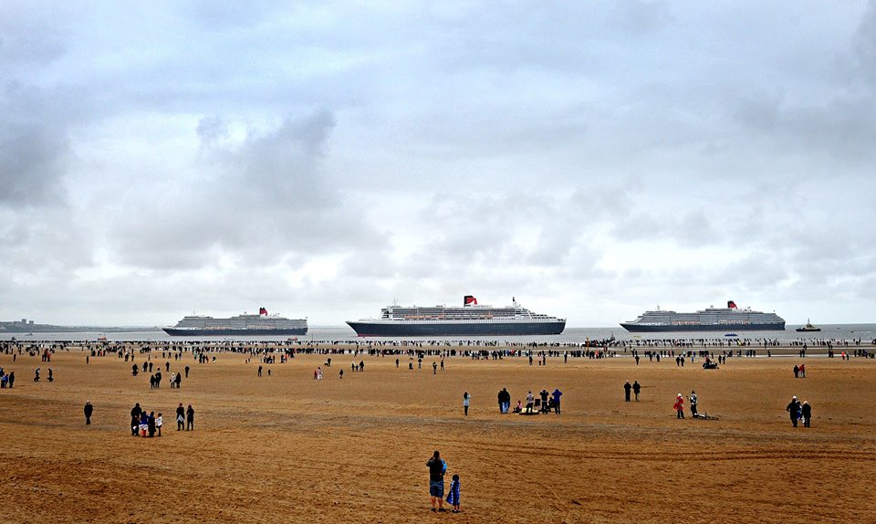 Thousands of people gathered on the banks of the River Mersey today to watch Queen Elizabeth, Queen Mary 2 and Queen Victoria mark the 175th anniversary of the founding of the Cunard shipping line.