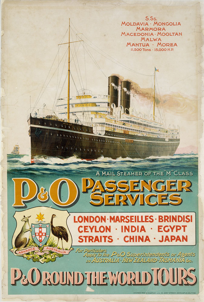 Also featured are some of the original P&O advertising posters. This one from 1910 depicts the traditional fortnightly service between England and Australia. There were 10 ‘M’ class ships and the Mantua, which is mentioned on the poster, was THE ship to cruise on out of London and Southampton both before and after WWI.