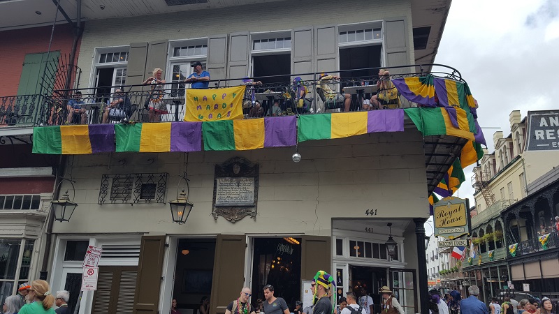 The weather in New Orleans was perfect for Mardi Gras – warm and sunny – and by 15:00 we were both tired, hot, hungry and thirsty. I’d made a reservation at a restaurant called Royal House before we left for the cruise, so off we went to cool down and fill up. Royal House is on Royal Street, which is just a short walk from Canal Street and a stone throw away from Bourbon Street. The restaurant was busy, but it wasn’t long before we were seated and browsing through the menu. I ordered the shrimp and deep fried grits stuffed with mozzarella. The food was nice, there was a lot of flavour, but my grits were a little overdone on one side and the presentation of the food wasn’t good. We also ordered some hush puppies to share and they were very tasty, I’d have those again. There were lots of people enjoying oysters while we were there – the restaurant has a rather impressive oyster bar – and one couple also ordered crab legs, which looked amazing! I did have food envy for a while. Although I didn’t have the best experience at Royal House, I would like to go back when it is not Mardi Gras and try some other dishes on the menu as the restaurant usually gets such good reviews. Royal House also has a sister restaurant on Canal Street called Creole Cuisine and the menu there looks great!