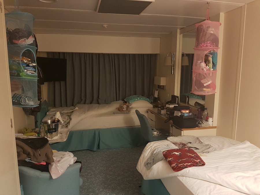 Our cabin is very comfortable and I love our little portholes. It’s our home away from home for the next 4 months and we have made it our own. Marian (TravelShopGirl) brought magnetic hooks, which we attached to the ceiling and then hung small storage bags from – it saved taking up drawer space. We also have some hanging storage in the bathroom and we made use of the space under the bed. All we need to do now is get through some of the toiletries etc, so we can make room for shopping in port! Below is a picture of our cabin, but I’ll take another soon – we were still mid-way through unpacking at this stage.
