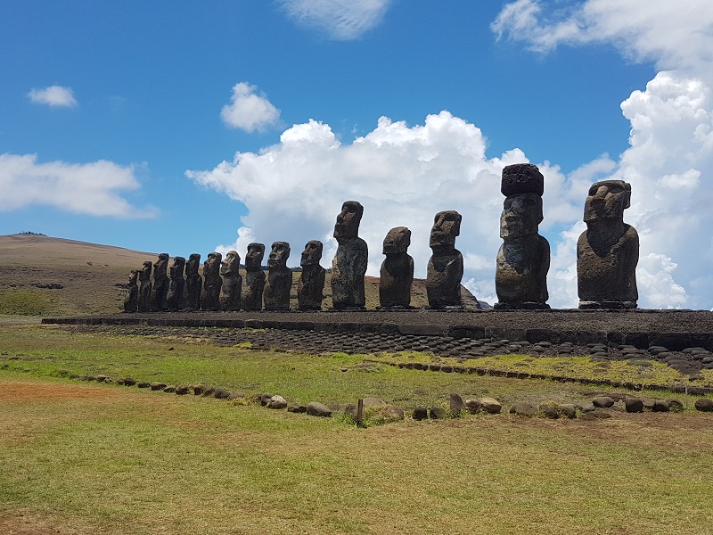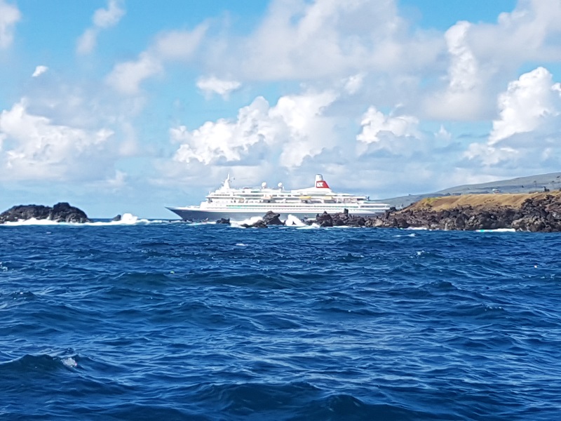 We spent several fun-filled days at sea before reaching our next port of call, Hanga Roa, Easter Island, Chile. There was sun, cloud and a tug-of-war. Yes, you read that correctly, a tug-of-war. Passengers, for obvious reasons, weren’t allowed to take part, but we could bet for the team we wanted to win – all of the money taken that day will be donated to the RNLI. There were several teams of 5 from various departments, including deck, housekeeping, senior officers, bar, galley and engine room. It was a very hot and sunny day, but the decks were packed several deep with people cheering and shouting. The overall winners were the group of senior officers, but the deck girls gave a lot of the teams a run for their money. The girls from the bars, they didn’t stand a chance, they were almost pulled off their feet! It was a fun way to pass a few hours. We also had a tropical deck party with BBQ that evening.
