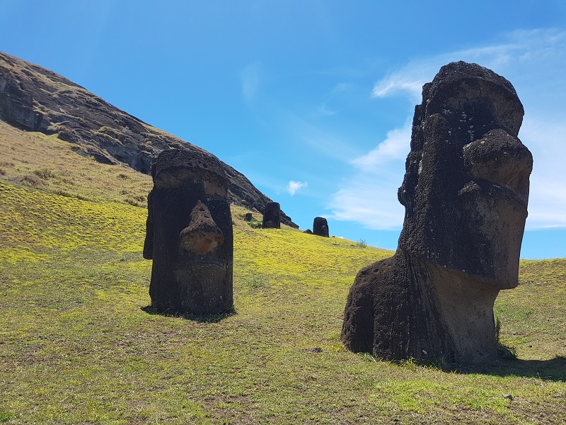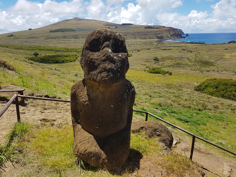 Our second stop was at Rano Raraku and I was blown away. I’d not researched Easter Island much before leaving on the cruise, but I had looked at enough to know what points were of the most interest to Marian and myself. I wasn’t prepared for Rano Raraku, I don’t think anyone could be. It’s known as the Moai Quarry and there are moai statues everywhere, around 397! Many of them are standing, although you can only see the heads and shoulders as the majority of each statue remains underground for preservation reasons. The stone here was used for 95% of the islands moai statues and it is an incredible sight. One of the most famous moai at Rano Raraku is Tukuturi. Unlike the other statues, he is presented with a beard and a kneeling posture, whereas most others are upright. It is believed that the statue represents a riu singer and it is likely that it is one of the last moai ever made.