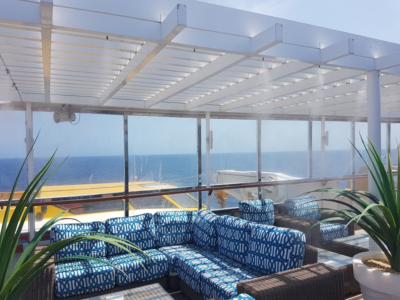I didn’t spend much time there, but Deck 9 was my favourite outside deck. It was quiet, full of comfy chairs, cooling misters and there was a pool and a bar. I prefered to sunbathe on other decks just because I prefer to sit in a simple chair – the cushions just make me even hotter – but I did really like Deck 9. I also liked spending time on Deck 6, that’s where the Poolside Grill is and that was my favourite place to eat (apart from at the Brigadoon for late night snacks). The below picture was eventually how Marian and I “styled” our own menu. We made a few little changes here and there, but it’s all available from the Poolside, which is open for breakfast and lunch when the weather is good.
