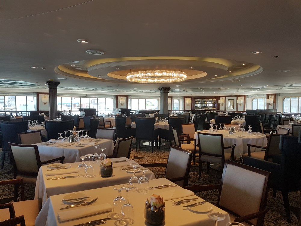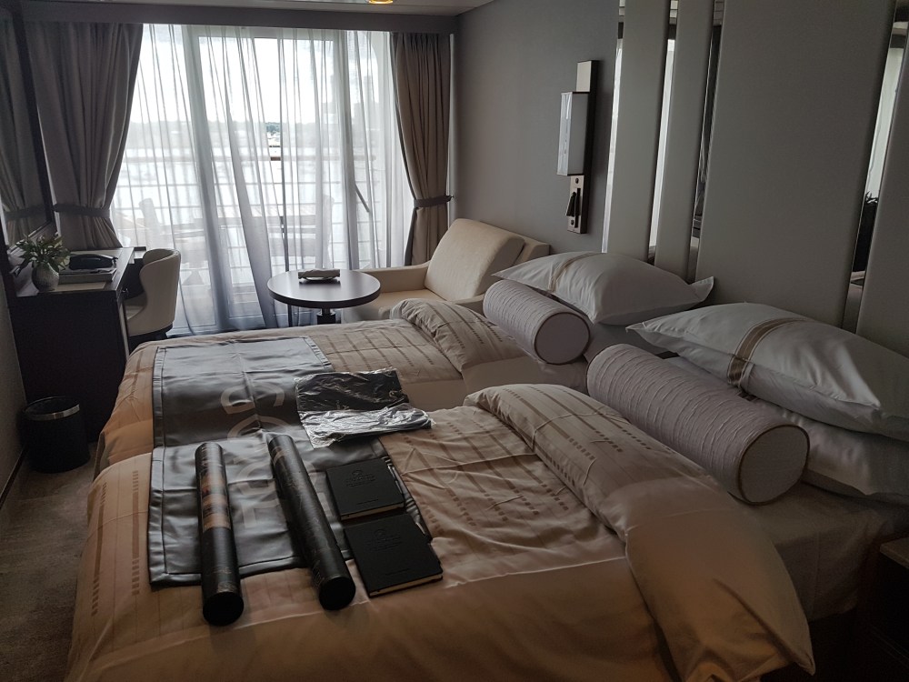 The Naming Ceremony was to begin at 5PM, so I found my cabin, unpacked, attended the muster drill and then prepared myself for the evening. I had a twin balcony cabin on Deck 7 which was welcoming and spacious enough for 2 people. The bathroom offered what you would expect and as with the public areas, everything was finished to an exceptionally high standard. The bed was very comfortable, and the linen was incredibly soft. The TV was larger than your average cabin television and there were USB points available for use by each bed. The balcony featured a table and two chairs.