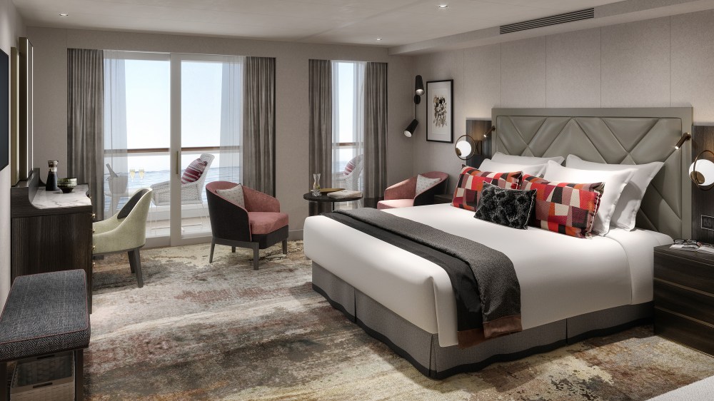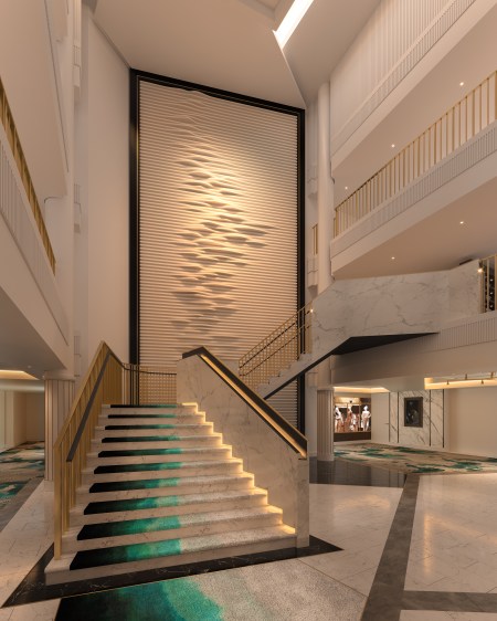 At the heart of the ship, The Living Room will feature a bar serving coffee, cakes and gelato during the day and cocktails at night. The architectural design will be strong and angular with a sculptural staircase and a full-height artwork as the backdrop.