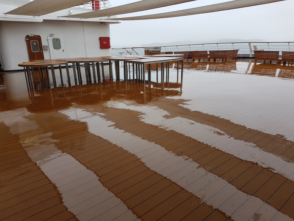 We sailed from soggy Halifax and made our way back out into the fog coated ocean and, believe it or not, I didn’t see the sea again for 3 days! It was fun, minus the fog horn going every minute, and reminded us we were on a ship. I snapped the below photo as we were leaving Halifax, you can just see land in the background if you look closely, but after 10 minutes or so, we could see absolutely nothing.