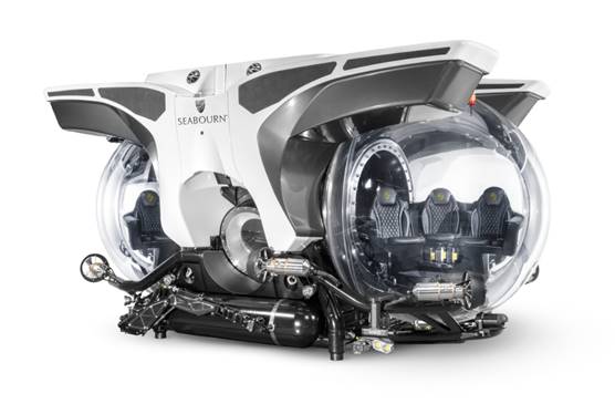 To maximise the guest experience, the subs will be outfitted with a host of optional equipment to enhance this once-in-a-lifetime opportunity. A 4k underwater video camera system will record the world outside while an internal video recording system will capture imagery of guests inside and their direct surroundings. Video footage can then be downloaded and projected on large screens in the Discovery Center during lectures aboard the ships. A six-function manipulator arm capable of lifting up to 32 kg (about 70 pounds) will also be mounted on the side of the sub. In keeping with the luxury experience found on Seabourn, each sub on both ships will be outfitted with custom embroidered leather upholstery, two air conditioning systems, a Bluetooth stereo system, and champagne chiller for guests looking to toast their voyage of discovery.