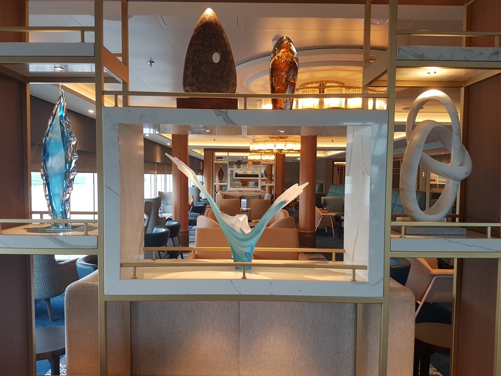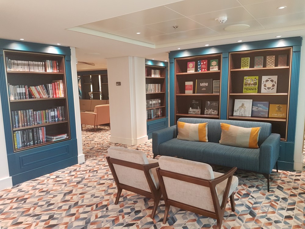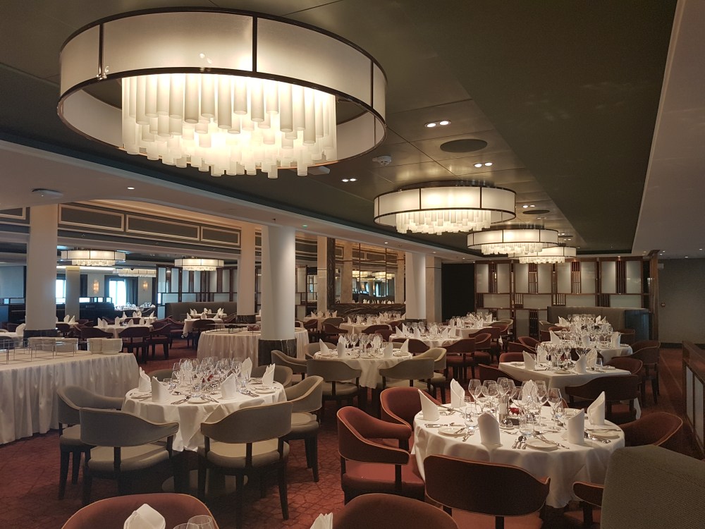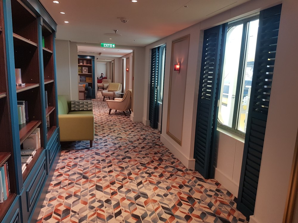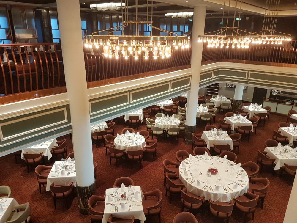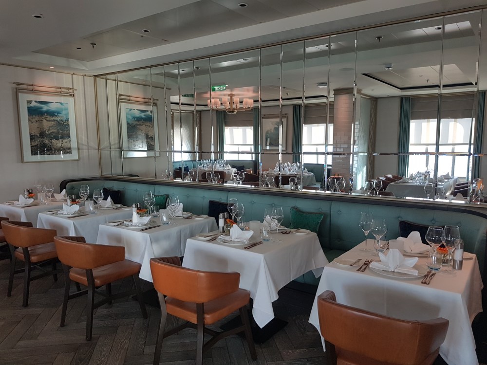 The atrium from above, showing decks 5, 6 and 7, where you’ll find the Library, Craft Room, South Cape Bar and living RoomThe gorgeous atrium as seen from Deck 5 – directly in front of the Living Room.One side of the Living Room. The Living Room bar is open from morning until 11pm. You can also get fresh finger sandwiches, pastries and ice cream here, and tea and coffee.A section of the library on Deck 6.The self-service coffee and tea area in the library. There’s no juice machine here, but there are 2 in The Grill.Another angle of the library, it extends across a large area but is broken into sections so it feels cosy.The Craft Room Deck 6The Card Room on Deck 6South Cape Bar on Deck 6. Est. 2019.There are several sofas and tables just outside the South Cape Bar, if you’d prefer something more comfortable. I love the vases!The promenade Deck, Deck 6.The Promenade Deck aftGet your laps in!One angle of the Britannia Lounge on Deck 12. One of my absolute favourite spaces onboard. This is the place for evening dancing and live music.The Britannia Lounge barI love the lighting above the bar in the Britannia Lounge.Furnishings in the Britannia LoungeIn front of the Britannia Lounge – there’s a door behind the band area.The Lido Deck. It’s a great place to enjoy day and night, and another of my favourite areas. I love the colours!A wide-angle shot from the other direction showing the pool and loungers, and 2 hot tubs at the back.A view point on Deck 13 aft.You can do laps on Deck 13 and Deck 6Shuffleboard on Deck 13.Shuffleboard in the middle and then cosy chairs and sofas for lounging.The Fairway on Deck 13 port side. You can play golf or a shooting game.Ping Pong tables on Deck 12.Don’t worry, the ice cream machine is still there! it’s on the Lido, next to the bar.The boiled sweets are still there, too. They are on the Lido (just outside The Grill) on the starboard side.Entrance to The Grill on Deck 12 aft. The Grill is inside and then there is outside seating on the verandah. Open for breakfast, lunch and dinner. The Grill is now a buffet dinner option on smart casual evenings. On formal nights, one side is waiter service and the other is buffet.One of the seating areas in The Grill. On formal evenings you have the choice of buffet or waiter service. On smart casual evenings it is a buffet. This photo shows it set for dinner.Another view of The Grill. This photo showing it set for lunch.Ready for Sunday roast carving in The Grill.Cheese selection as set up buffet-style.Salad selection in The Grill.Salad bar and outer grill on The verandah. You can enjoy self-service salad or table service for fish and chips, burgers, hot dogs and more.The grill on The verandah.Saga’s famous fish and chips at The Verandah grill.The Verandah as seen from Deck 13.The Grand Dining Room on Deck 5. Open for breakfast, lunch and dinner.Another section within The Grand Dining Room.Looking down into The Grand Dining Room from The Club above on Deck 6.The Club by Jools Holland Deck 6. Open for dinner until 9pm and then it becomes an evening entertainment venue with live music.I love The Club. It’s my joint favourite restaurant (with East to West) and the ambience is perfect.On the port side, you can observe the galley team preparing the food for The Club.Some of the galley team at The Club.A filet mignon with thrice cooked chips and creamed spinach – my favourite!East to West Deck 6 aft port side. Open for dinner only.The new look East to West is gorgeous. The colours are fresh and vibrant.King prawn massaman curry with jasmine rice, wilted pak choi and Chinese cabbage – absolutely delicious and not spicy at all.Coast to Coast restaurant is on Deck 6 aft starboard side. Most dishes are seafood, but they do have a few other options. It’s ALWAYS fully booked, so make sure you get in there early. Open for dinner only.Two seater tables as you enter Coast to Coast.Larger tables in Coast to CoastLobster thermidor at Coast to Coast.The Secret Garden Deck 6 aft outside East to West and Coast to Coast.Her gorgeous tiered stern. Each deck has an aft access door on either side and a set of stairs either side. You’ll also find some sort of seating area on each.And from above in the sunshine.The gym is located on Deck 13 forward – above the Britannia Lounge. it can be accessed via the Deck 13 port side forward staircase (where the S500 cabins are) or via Deck 12 on the starboard side. Just before you enter the Britannia Lounge (starboard side), you’ll see a staircase on your left, that leads you to the gym.The hydrotherapy pool within the spa on Deck 5. The spa is open 8am to 8pm.Hot stone beds opposite the hydrotherapy pool.The infra-red saunaOne of the treatment roomsThe Playhouse Theatre during a performance from Jools Holland and Ruby Turner. This space is used for theatre-style shows, lectures and live music.The launderette on Deck 8. There’s also one on Deck 10. Washing powder is still provided.The Medical Centre on Deck 4. That’s as much as we all need to know about that! 😉The Shop on Deck 5. There’s also a jewellery shop on the other side of the Living Room.One of the stairwells showcasing the incredible art onboard. It really is fabulous!The new interactive TV system in each cabin is very good. They’re still working on additional features, but there’s a great movie collection.