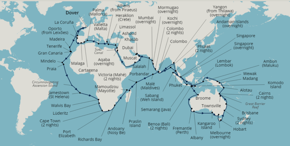 Other destinations that I’m excited to visit for the first time are Jamestown, St Helena; Kangaroo Island, Australia; Cairns, Australia; Melbourne, Australia; Hobart, Tazmania; Wewak, Papua New Guinea; Goa, India; Dubai, UAE; Muscat, Oman; Salalah, Oman; and Ashdod, Israel.