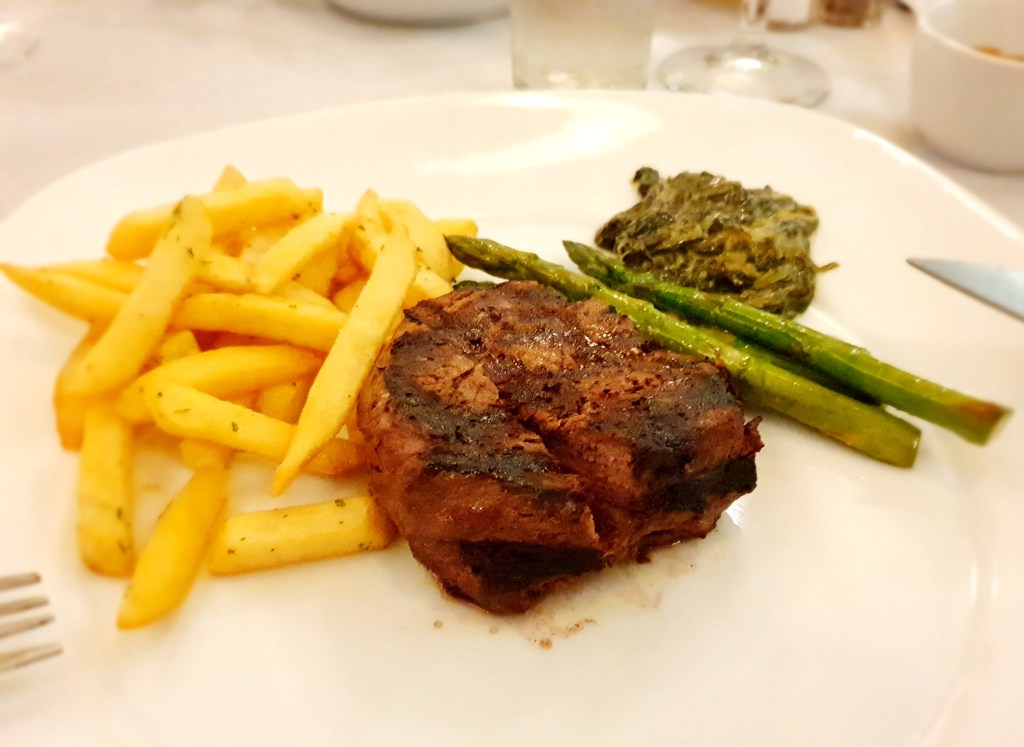 80z filet Mingon with creamed spinach, asparagus and garlic and herb fries – Crown Grill (additional charge)
