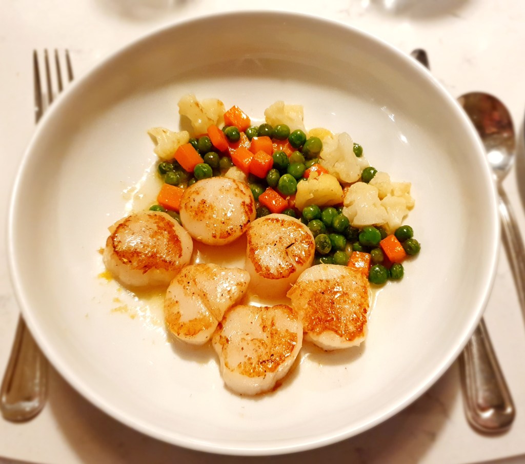 Pan-seared scallops in a lemon sauce with mixed vegetables – Bistro Sur La Mer (additional charge)