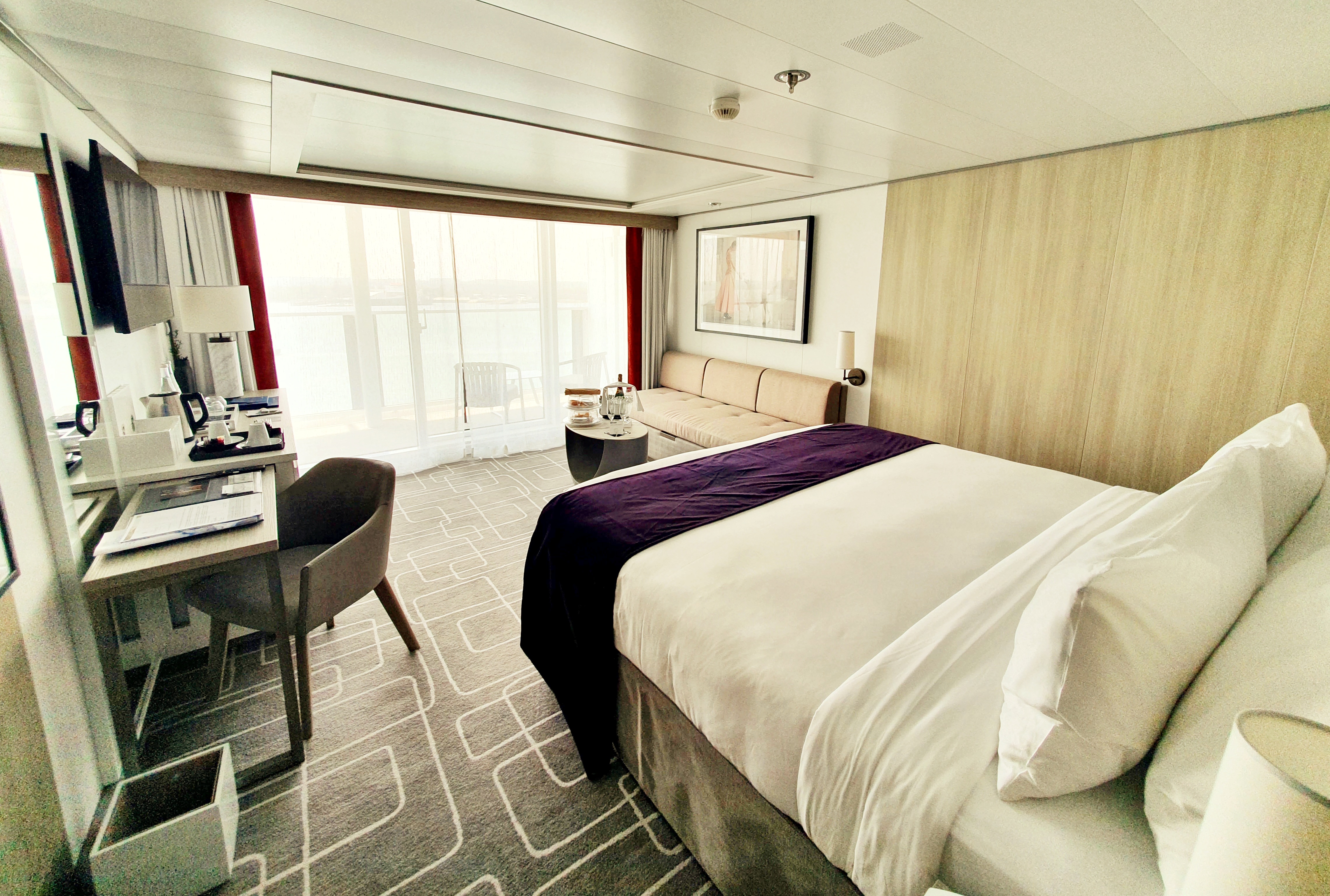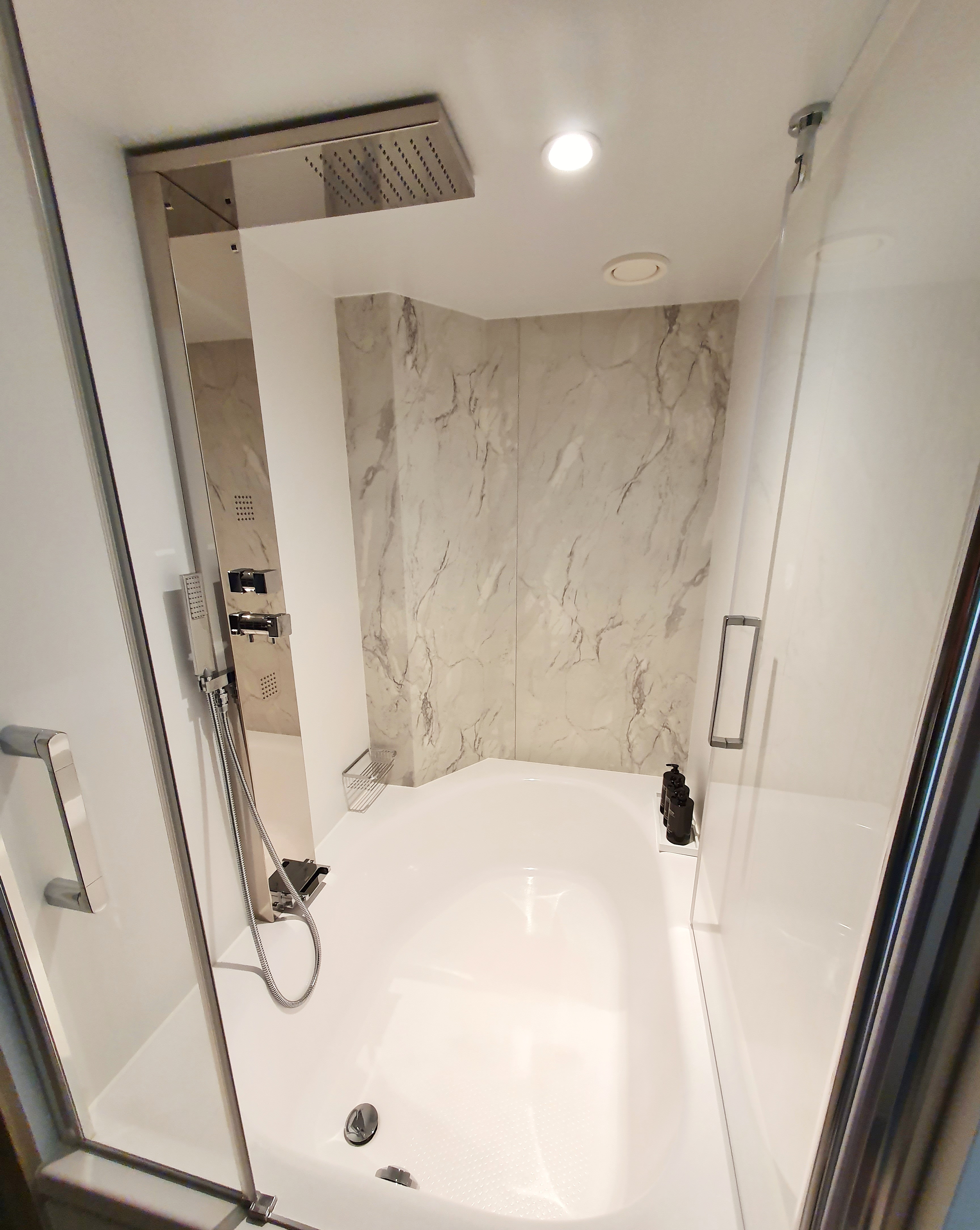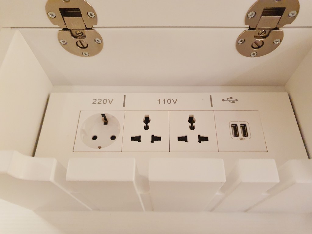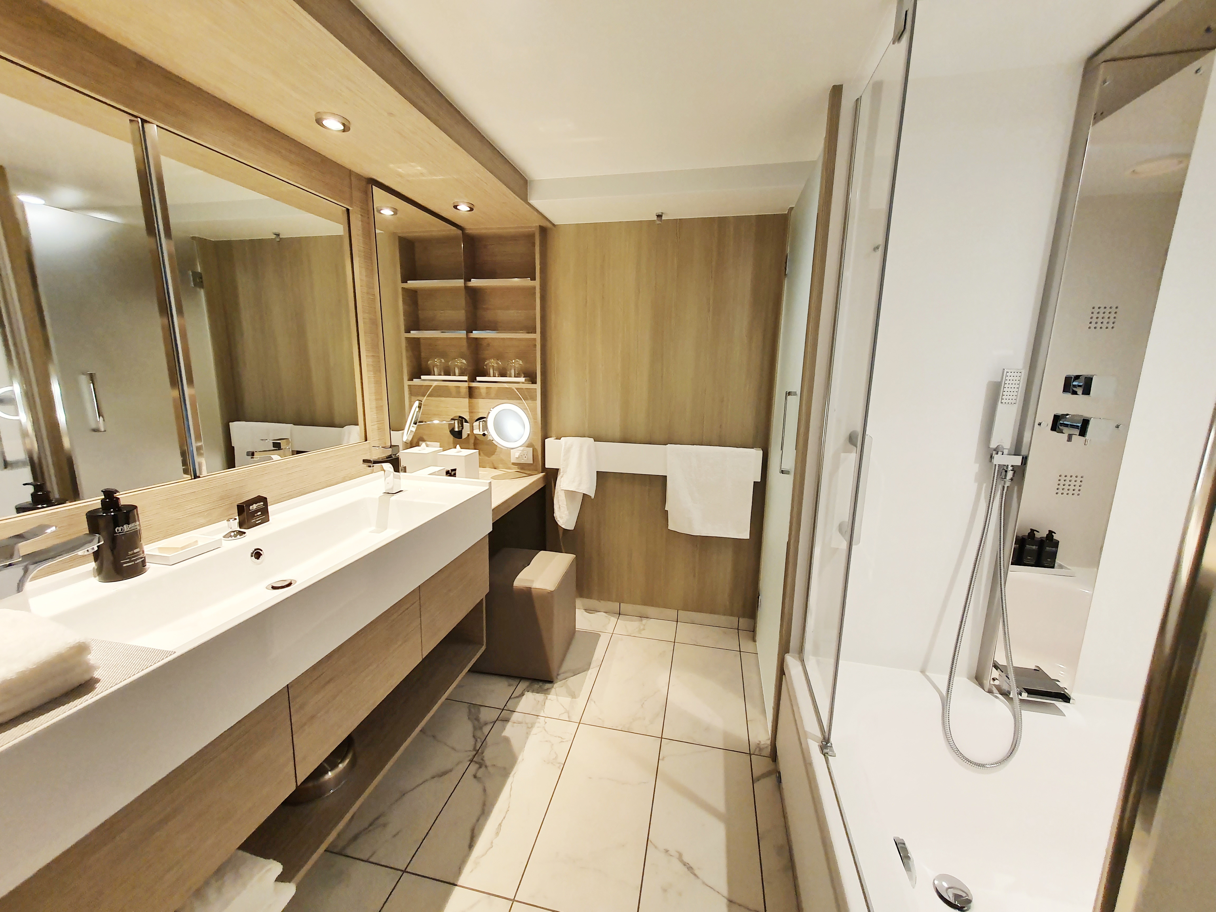 I had a Sky Suite for the duration of my stay, and it was stunning! I loved the size of the space and the fact the bed was positioned facing the balcony doors, so you could sit and watch the world go by. I also really liked the stylish box on the dressing table that conveniently concealed a selection of plug sockets and USB points – nice touch! The bathroom was huge with a colossal bath/shower system. I’ll admit, when I first used the shower, I didn’t know what things to turn or press, so much so, it took me a few minutes to figure out how to turn the shower head I was using off, once I finally got it on.