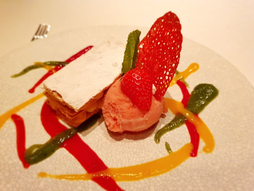 I tried Colours & Tastes first and my gosh, it was delicious! You’re served a selection of breads and sauces while you wait for your starter dish, but I tried to only sample and not eat all of it – I needed to leave space for the rest of the meal. To start, I went with the salt & pepper calamari fritto with kafir lime jelly, and it was excellent. The calamari were perfectly cooked, there was lots of flavour, and the tempura aspect was very light. For my main course, I decided to keep the seafood theme going and I ordered the spice paste marinated cod with tamarind chutney, wilted Asian greens and coconut rice. Another home run from the chef! It’s not a dish I’d usually order, but I was so glad that I did. It was a beautiful piece of fish! By now, I can hardly breathe, and I didn’t really want a dessert, but the girls twisted my arm, and I went for the mango & lychee mille-feuille with street graffiti and raspberry sorbet. However, it didn’t end there! In typical Fred. style, they also brought out the five-spice chocolate cake with hazelnut and chocolate sauce. I was nearing a food coma by this point, so I had a sample of each and the winner for me was the mille-feuille.