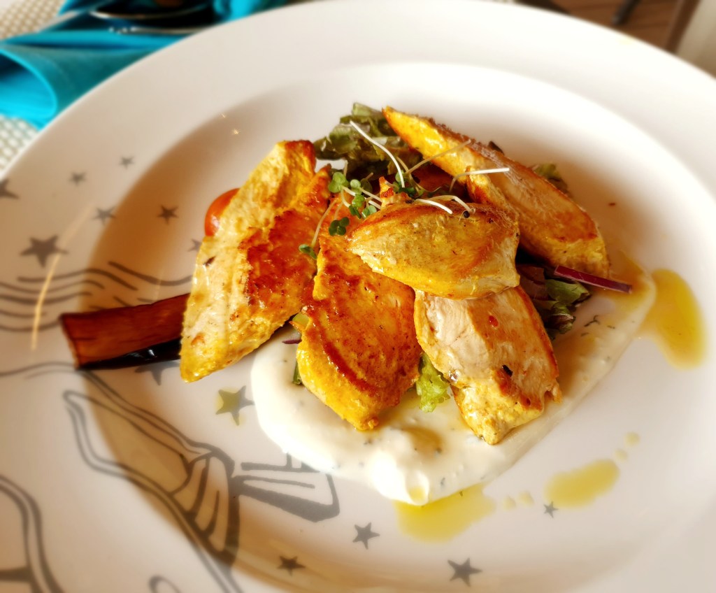 FOOD! It’s a huge aspect of any cruise and the Poolside Café is just perfect! I was also pleased to see this time that the menus were changed more frequently (although I still wish they would bring back the chicken skewers with hummus and warm tortilla bread – that was my absolute favourite) and I’d probably say some of the portion sizes had increased slightly, too. I must admit, I definitely over-indulged and I would tend to have my main meal of the day at the Poolside and then explore afternoon tea – having also had breakfast! So, to break it down for you, the Poolside is exactly as it sounds, it’s the poolside restaurant on the Lido Deck and you can get everything from fish & chips to a small Ploughman’s. The reason it’s one of my favourite dining options (and not just on Fred., I mean in general) is because it mixes light and casual with naughty and fried. You can always order a beef burger or fish & chips, but they also do some very nice grilled chicken and salad dishes, and fresh tuna steak. It’s just a variety of incredibly good food that has had effort put into it. I really like the Santa-Fe-salad, the fish & chips are always excellent, and the grilled halloumi with salad & balsamic is a tasty vegetarian option.