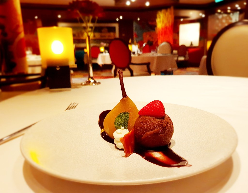 Before reaching Southampton, there were 2 more things I had to do, and one was to go back to Colours & Tastes. I’d spotted the new menu by chance as I passed one morning on my way to Guest Services, and I had to try it. This time, it was coconut fried shrimp with green mango salsa to start, followed by Indonesian chicken satay with peanut sauce. I was so happy! I loved the fact the skewers for the chicken were lemongrass, so there was so much flavour in every bite. For dessert, this time, I tried the five-spice pear with chocolate sorbet and peanut brittle. I enjoyed every meal I ate on Bolette, but this one was my absolute favourite.