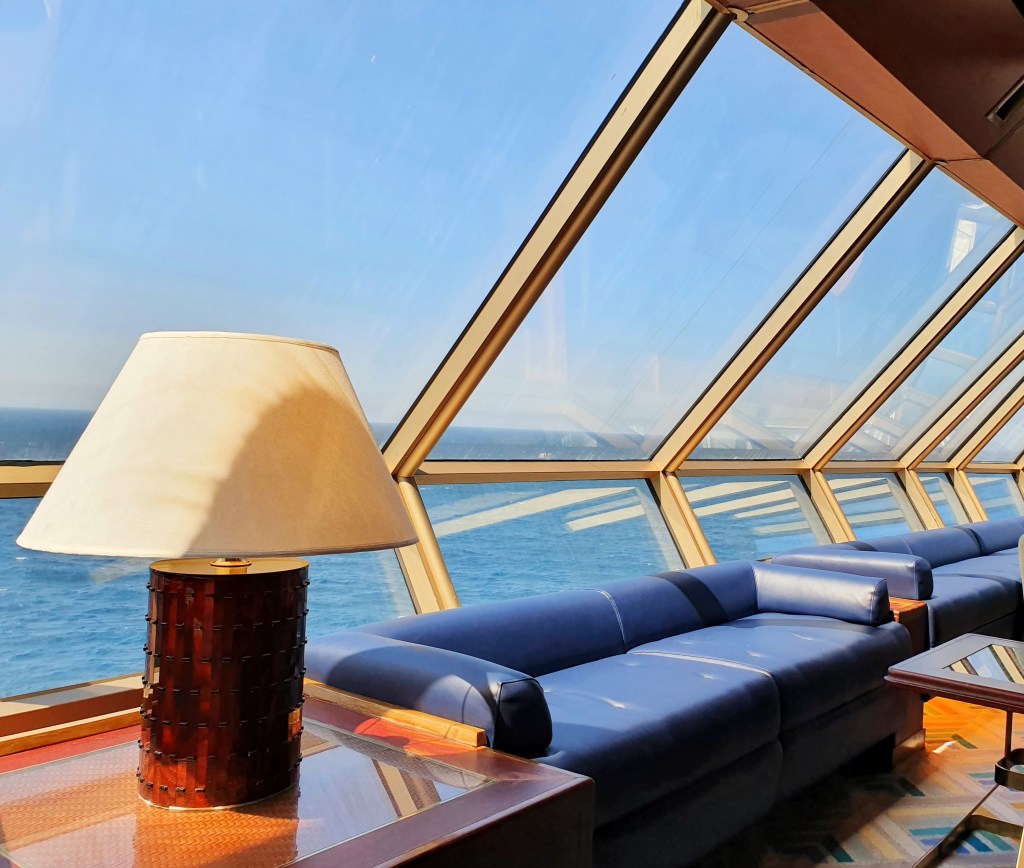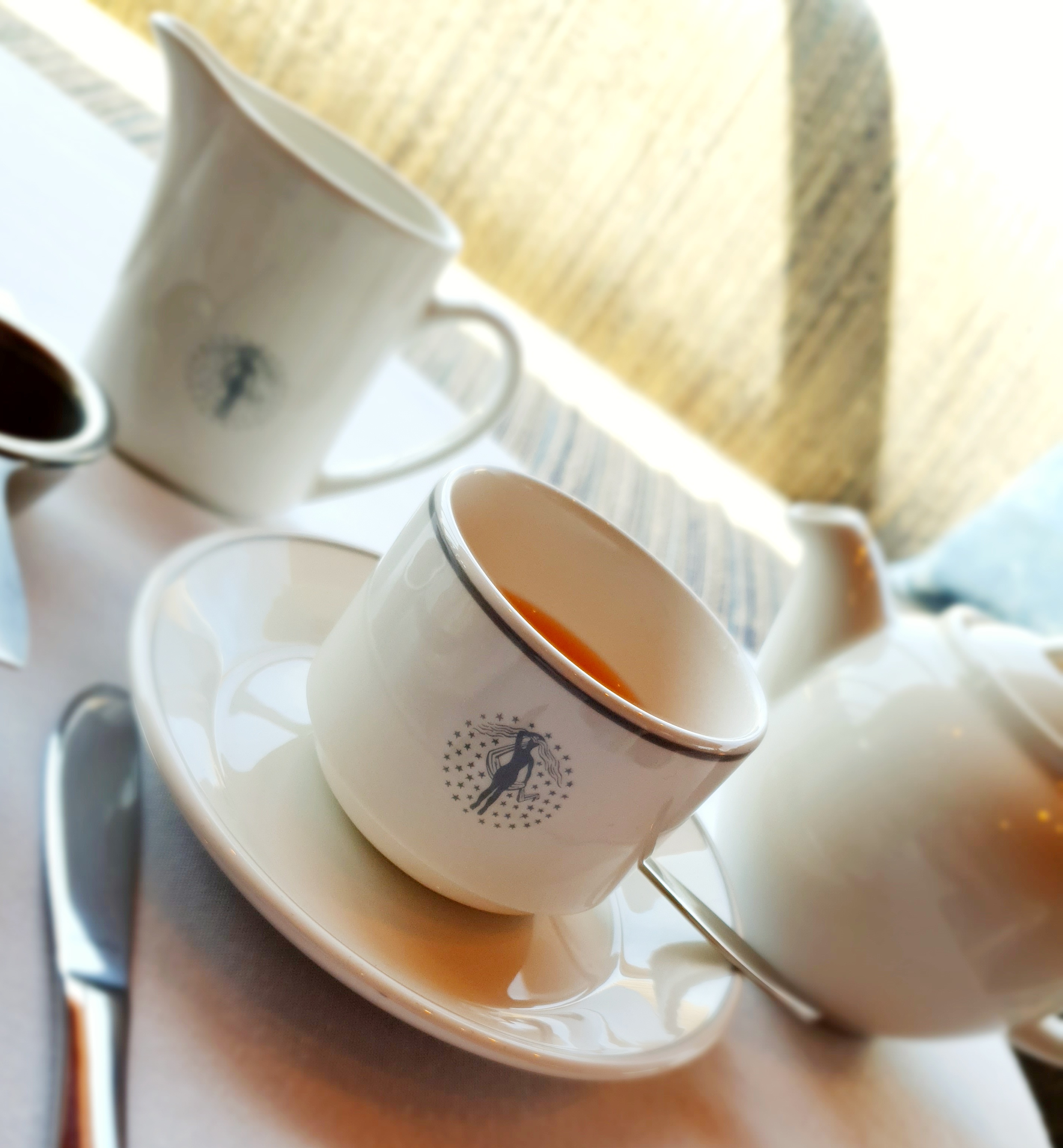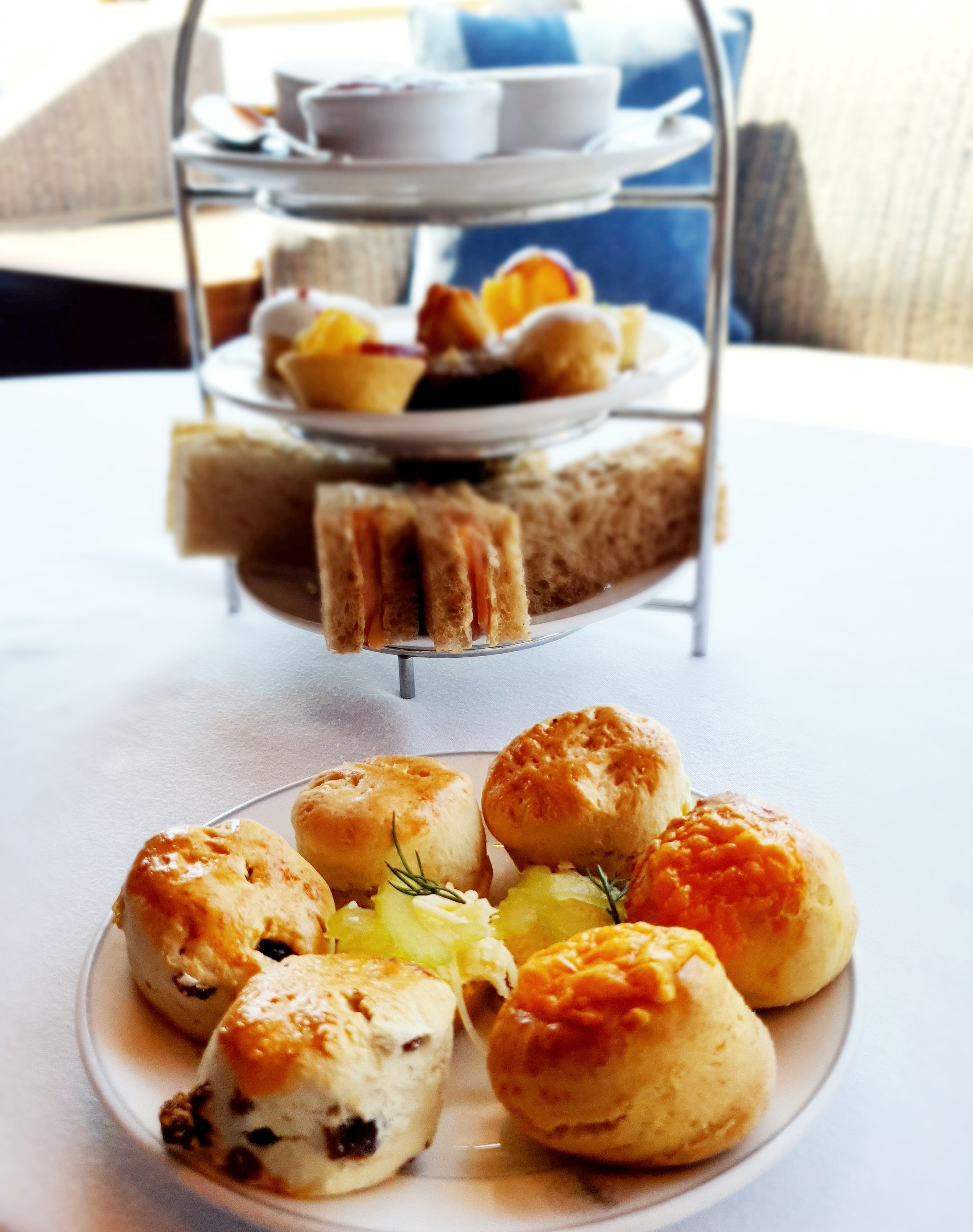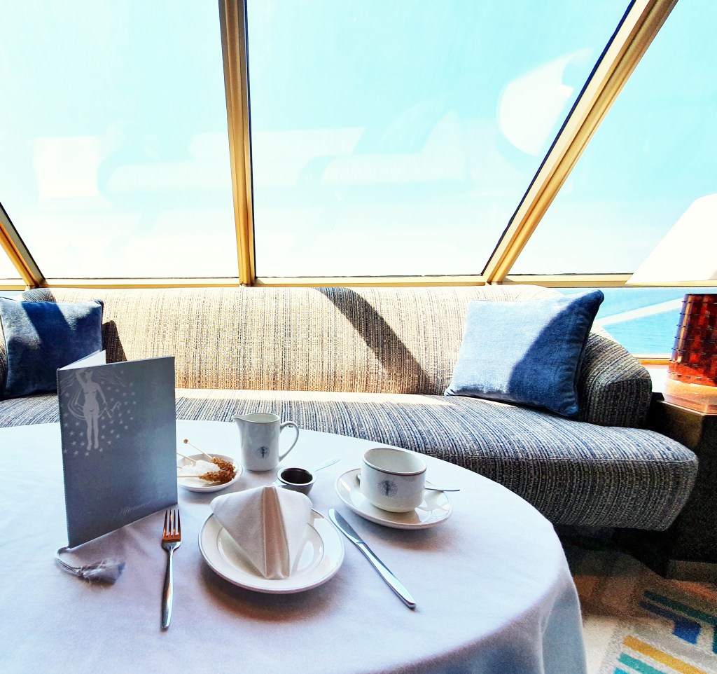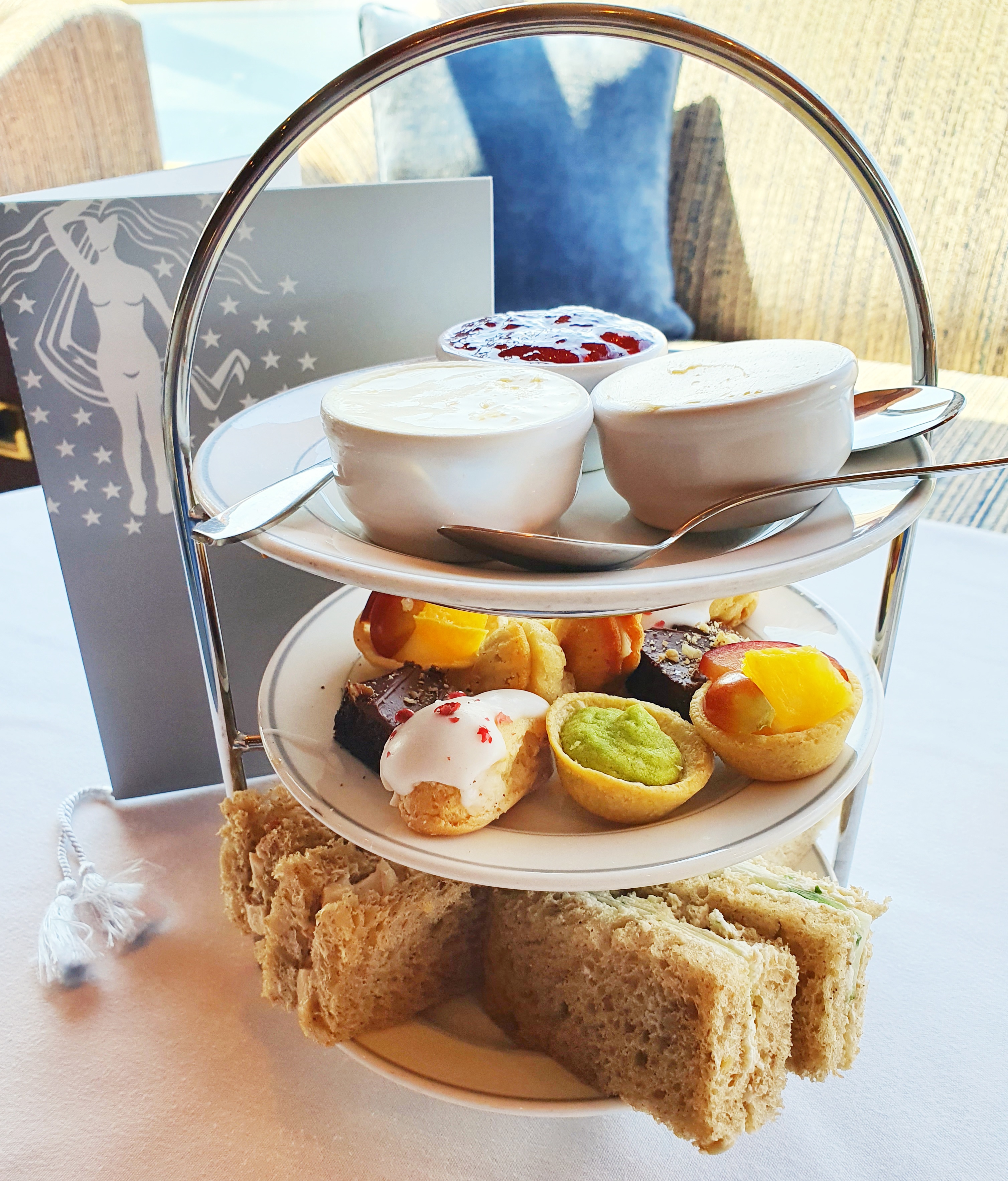 The dreaded ‘day before the day’ had arrived and once I’d finally sorted myself out with some packing, I took time to wind down with a Traditional Afternoon Tea in The Observatory. I’ve tried this several times when sailing with Fred., but this time it was a little different, and I liked it! I get the impression (but forgot to double check) that the menu for this must also change now and I don’t recall it ever changing previously. I only say this because the captain was on the next table and the tea he asked for, the waitress had to go and get from the Bookmark Café. The ladies he was having afternoon tea with said that’s not on the menu, to which he then realised it wasn’t and said they must have changed the menu. So don’t hold me to it, I was just eavesdropping on another conversation, as you do. Anyway, the set-up is the same as it has always been – white gloved service in a sectioned off area with soft live music. It was lovely. I had a lower level of four sandwiches, middle level of petite cakes and pastries and the top level was clotted cream, butter, and jam. It was all very nice; I particularly liked the chargrilled chicken sandwich and the egg sandwich. When I asked for a scone, a plate of 6 arrived! 2 plain, 2 fruit and 2 cheese – that was new to me. They were warm, light, and delicious!!! I think out of the 3, the cheese one was my favourite. I enjoyed all of this alongside some loose leaf wild Roobis tea.