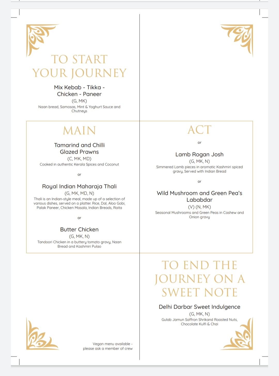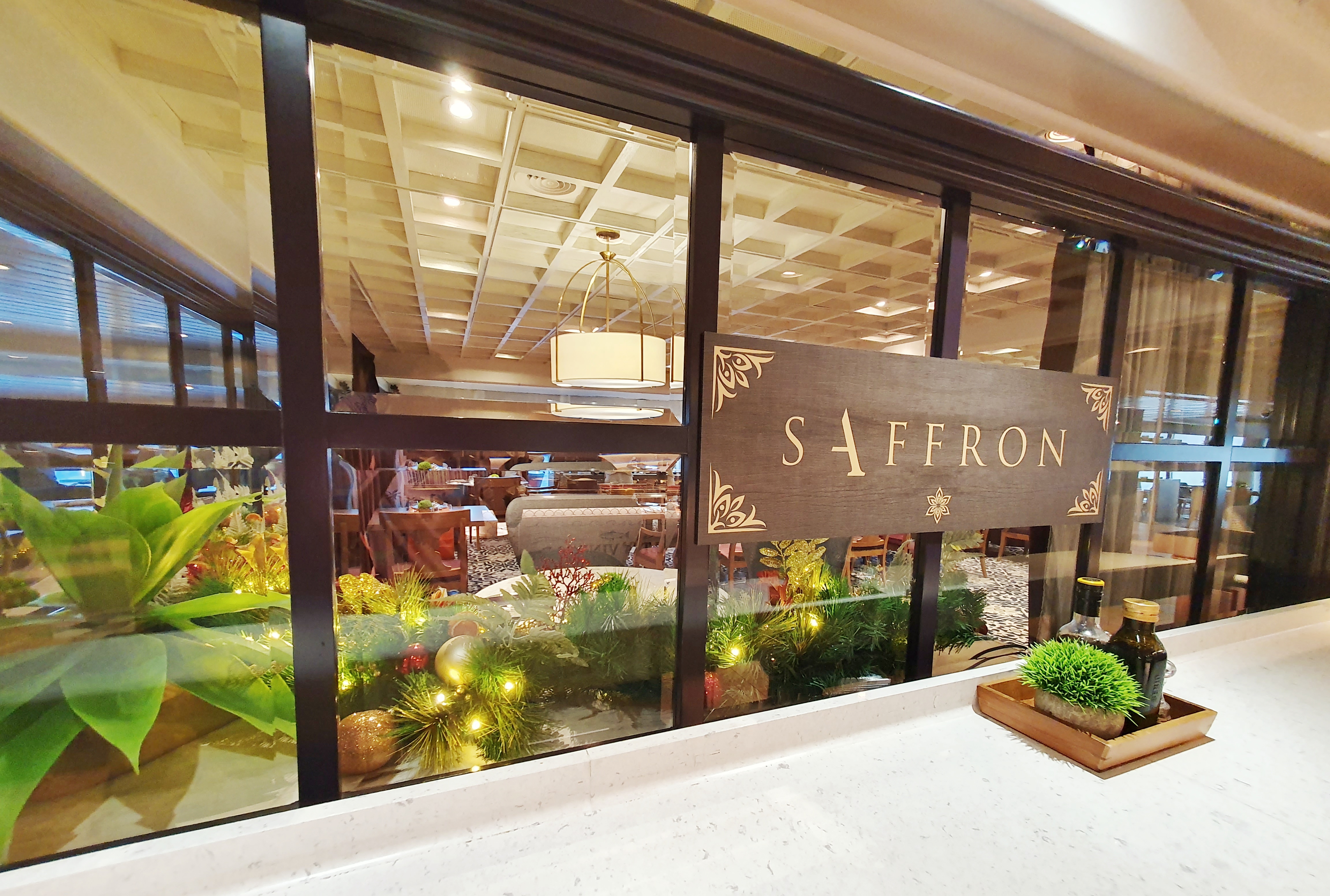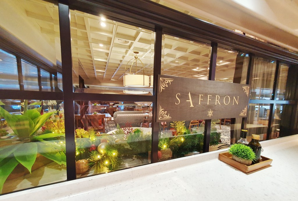 We also dined in the ships’ 2 speciality restaurants – Saffron and Sea & Grass. I must be honest; I wasn’t expecting the portion sizes in Sea & Grass that were served. It’s a 7-course menu, so I thought they’d be tiny little mouthfuls, but I was SO wrong! This is an epic culinary journey and to really make the most of it, just completely forgo lunch that day. Each dish is served as per menu order, and you only select for your main course. I’ve included the menu so you can see everything that’s served and then the main course choice. The only thing I didn’t like was the goat’s cheese – I’m not a huge cheese lover to begin with but can now say goat’s cheese is definitely not the one for me. The cost at Sea & Grass is £24.99 per person and it’s worth it.