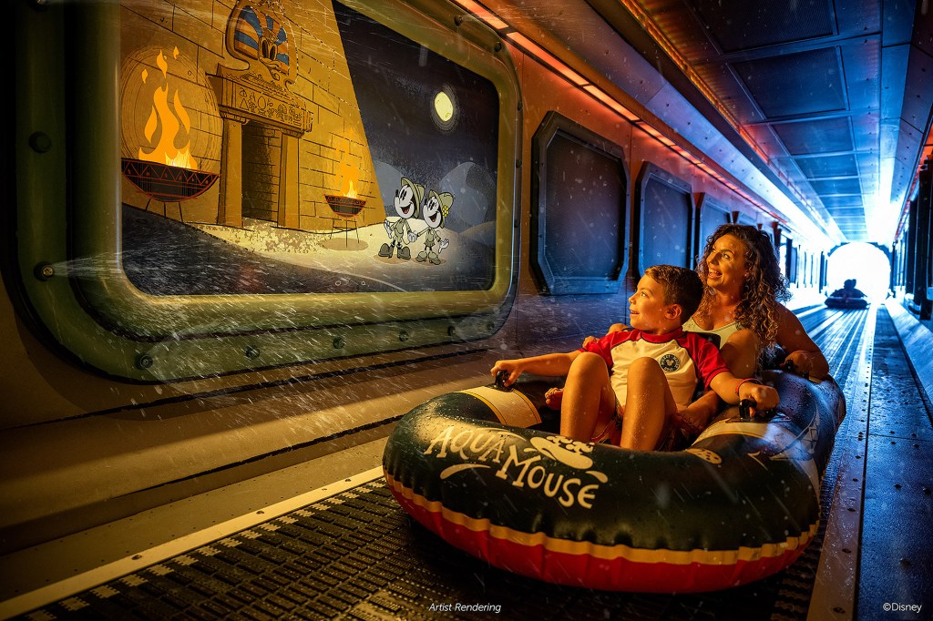 AquaMouse: Curse of the Golden Egg, Disney Cruise Line’s own attraction at sea, will plunge guests into the world of Mickey Mouse animated shorts. Suspended high above the upper decks, powerful jets will propel two-person ride vehicles through 760 feet of winding tubes, offering breathtaking views of the ocean and the ship below. Onboard the Disney Treasure, AquaMouse will introduce a new storyline that follows Mickey Mouse and Minnie Mouse on a zany misadventure into an ancient temple for a glimpse of the legendary treasure within.