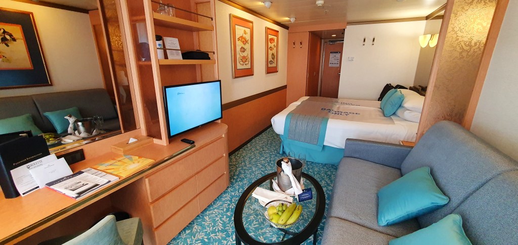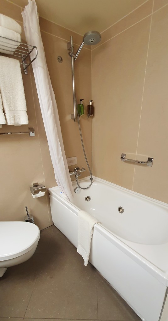 Embarkation was in Newcastle, again, super convenient for me as it meant a 10-minute journey to the port. I have to say, I was so fortunate! The weather was atrocious, but I was onboard in the warmth when the heavens opened, and the thunderstorm rolled in! OK, not great sailaway weather but did I care? Not one bit! I was onboard, I was content. I dropped my bags in my cabin, this time a Junior Balcony Suite on Deck 6. It was beautiful. Signature Fred. Olsen from cabin door to balcony door and to my delight, there was a jacuzzi bath in the bathroom – I’m obsessed with these baths! For anyone considering one of these cabins for a longer sailing my advice would be to go for it. They’re very comfortable and the storage space is immense!